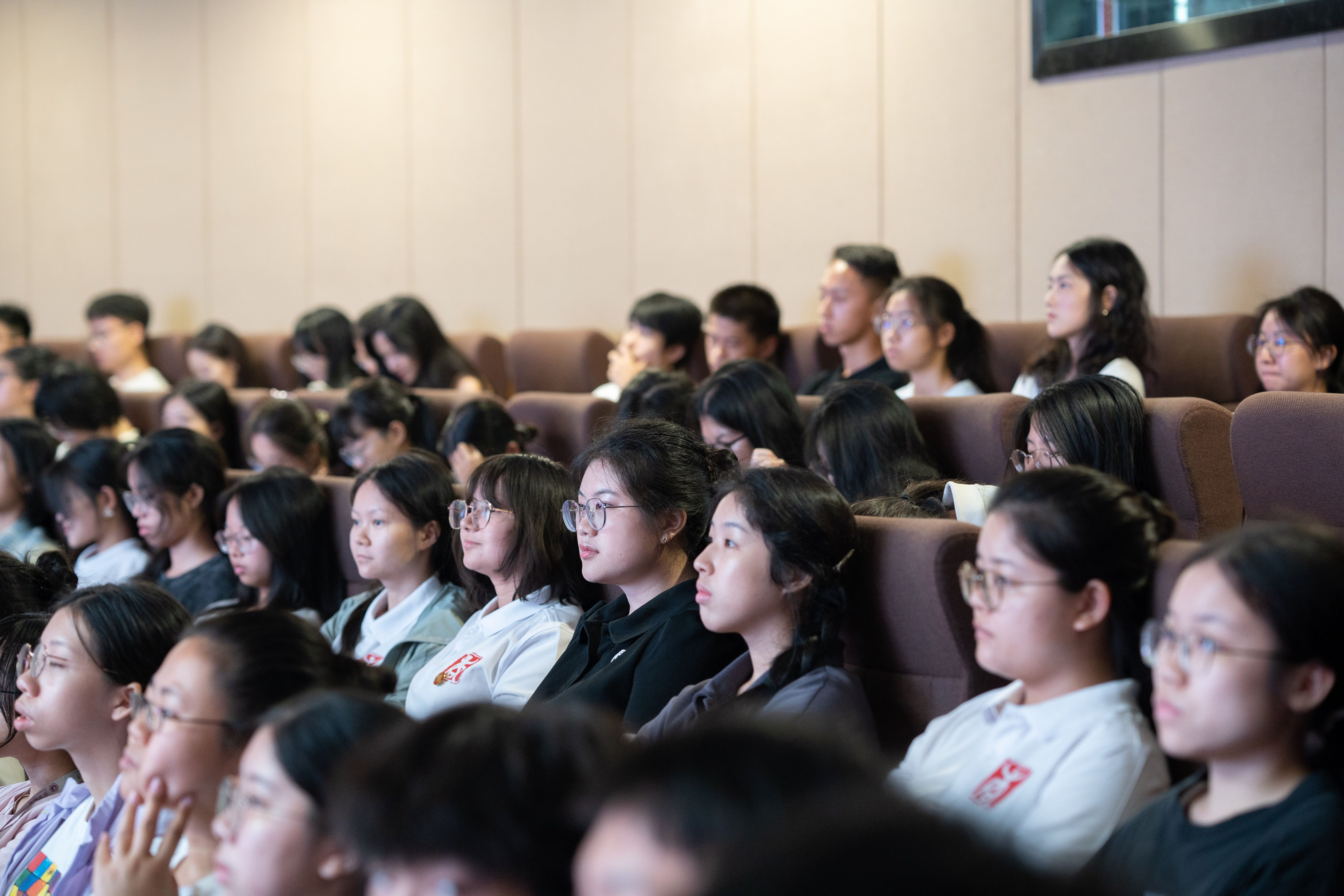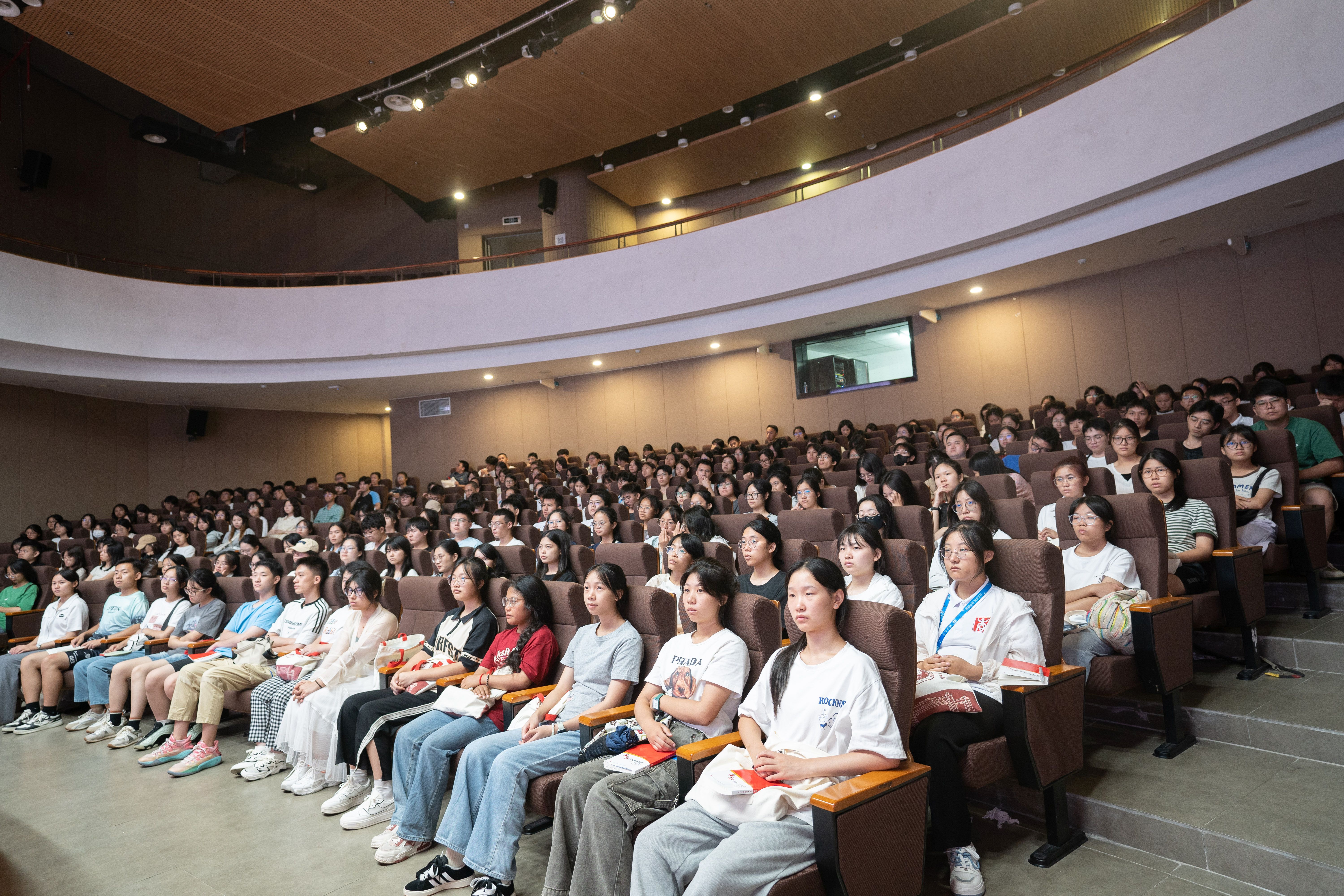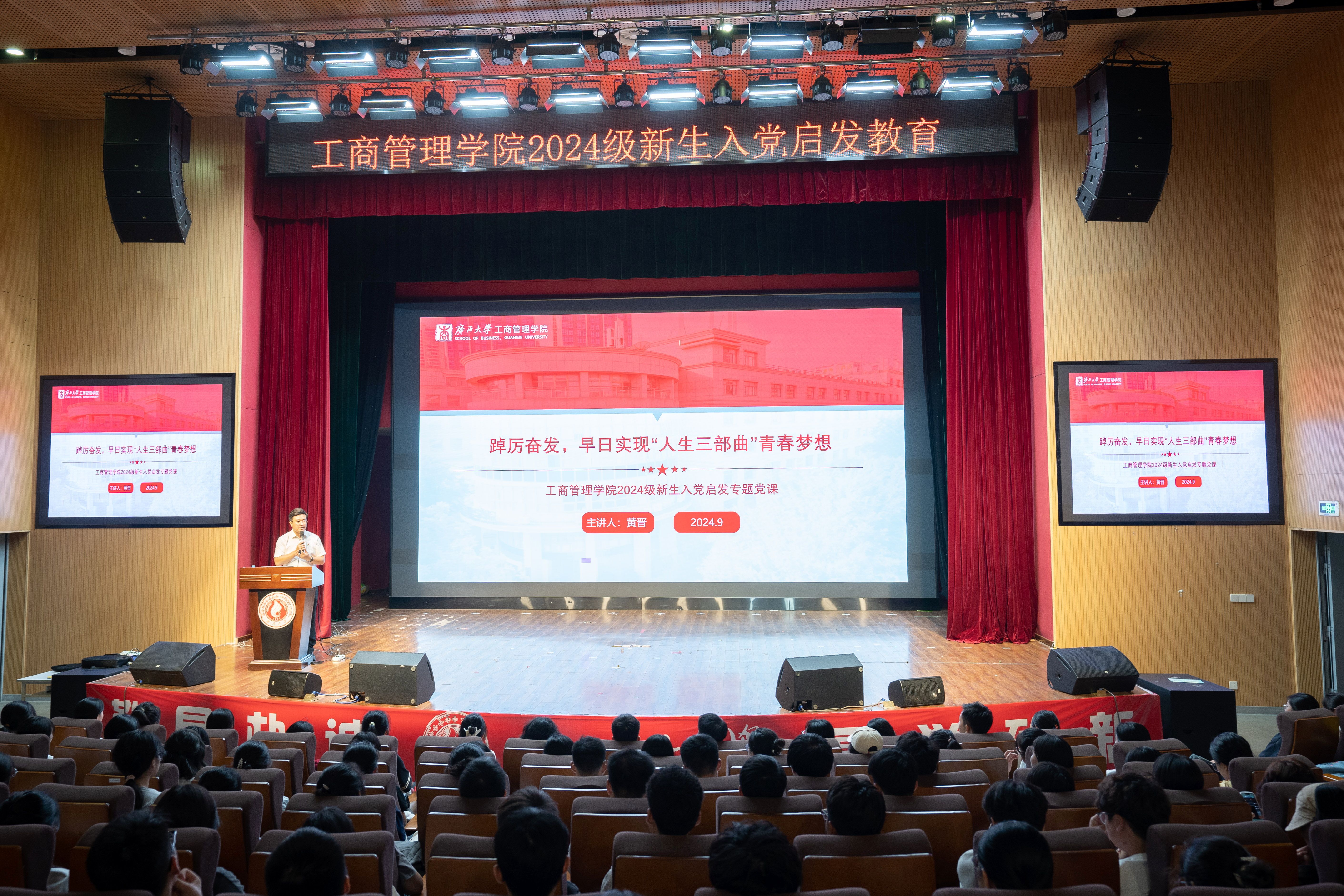 为加强学院2024级新生理想信念教育,进一步做好新生入学后的早启蒙、早教育、早培养工作,激发同学们对党的信仰和追求,引导青年学生听党话、跟党走,9月6日上午,我院党委在学校大学生活动中心小剧场开展2024级新生入党启发教育。专题党课由学院党委书记黄晋主讲,院党委副书记肖克宁、组织员黄照温、学工组辅导员郁文丹、管雅娣与全体新生一同参与学习。