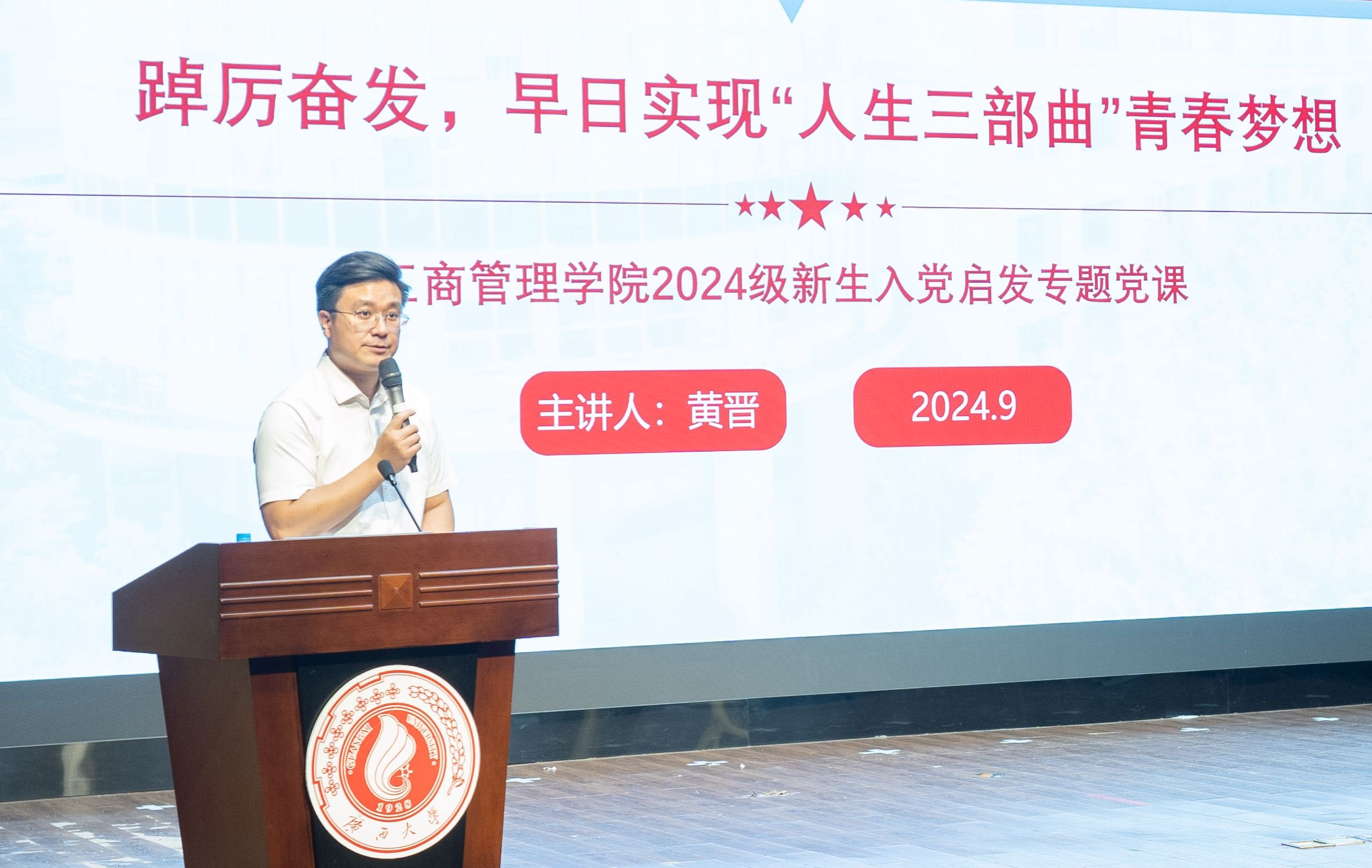 课上,黄晋书记深入浅出地阐述了中国共产党的性质、宗旨、使命以及指导思想,重点学习习近平新时代中国特色社会主义思想,通过生动的历史事例和鲜活的现实案例,引导新生们深刻理解中国共产党为什么能、马克思主义为什么行、中国特色社会主义为什么好。他还详细介绍了学院学生党员队伍的基本情况、入党的基本条件、基本流程和培养考察机制,为新生们勾勒出一条清晰可循的入党之路。他鼓励新生们要勇于担当时代责任,将个人理想融入党和国家事业发展大局之中,早日实现“人生三部曲”青春梦想。